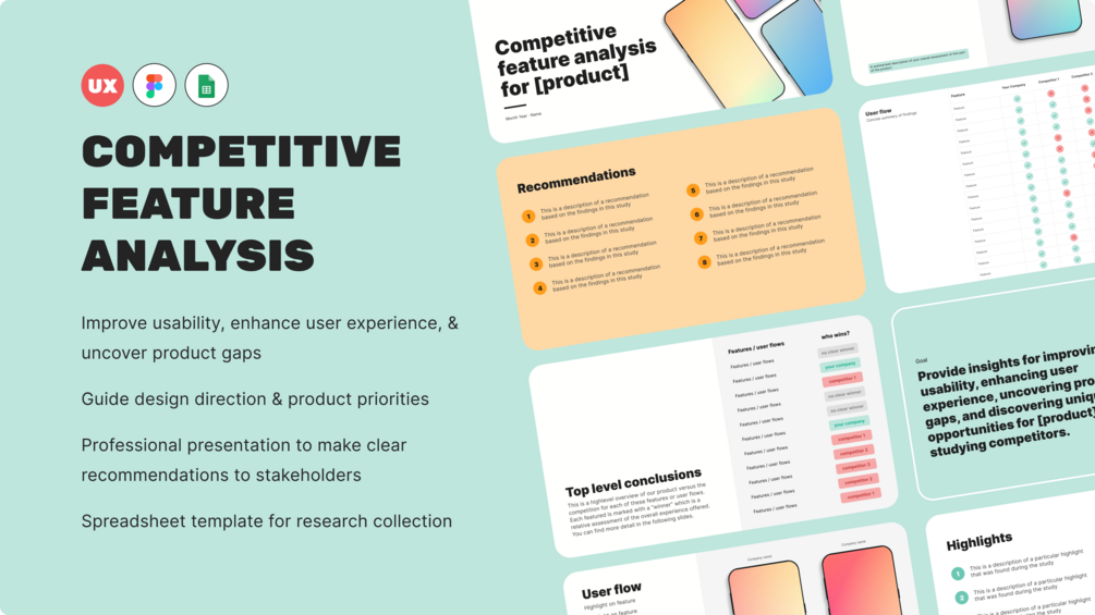 I've created these templates to help you not only collect the research but, more importantly, present your findings. As a principal designer with over 10 years of experience I've had these reports remarked as "one of the best and most useful competitive analyses I've seen" by a company CFO.